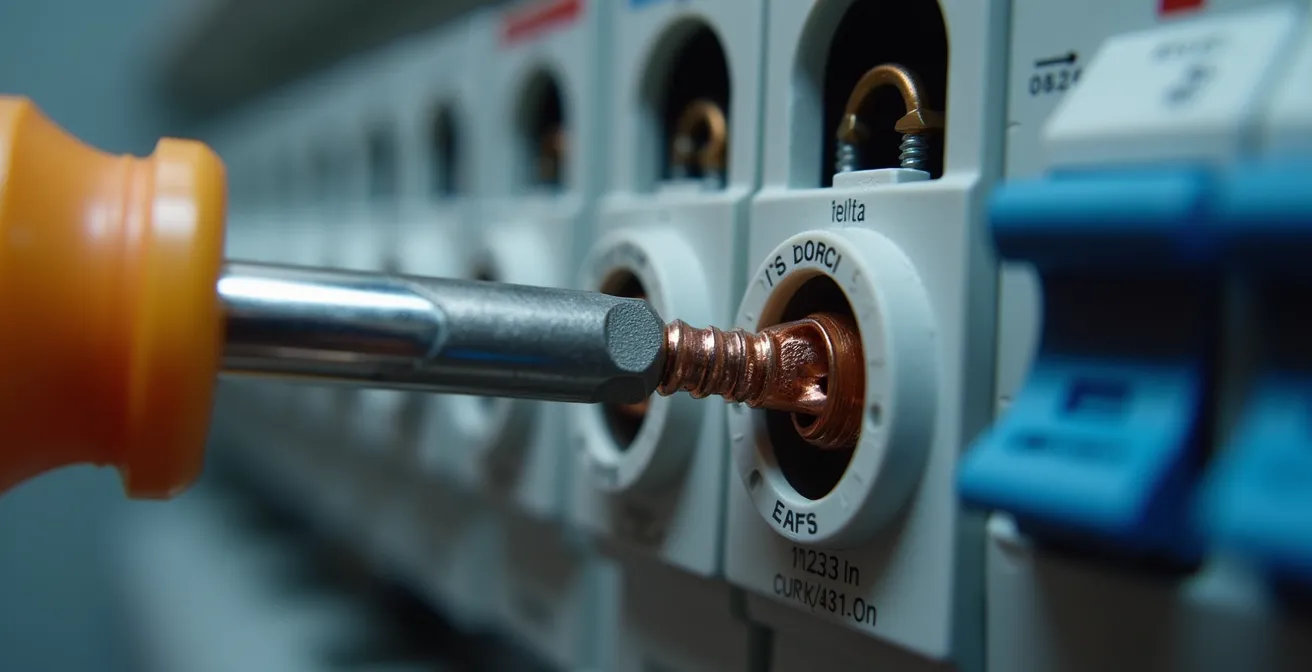 L’outil idéal pour cette opération est le tournevis dynamométrique, qui garantit d’appliquer la force exacte. En son absence, un serrage « ferme mais sans forcer » est une première approche. Selon les spécifications, par exemple celles de Schneider Electric pour sa gamme IC60N, un couple de 2 N.m est requis pour les disjoncteurs jusqu’à 20A, et jusqu’à 3.5 N.m pour ceux allant jusqu’à 63A. Cette opération doit impérativement se faire HORS TENSION, après avoir coupé le courant au disjoncteur général.