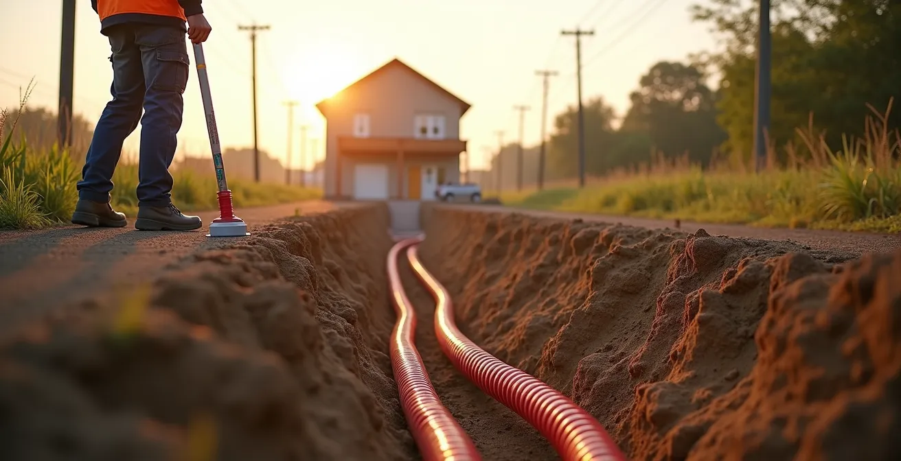 Une fois qu’Enedis a amené le point de connexion en limite de votre propriété, une nouvelle phase commence : les travaux sur votre parcelle. C’est ici que votre responsabilité est pleinement engagée. La tranchée qui relie le coffret de branchement (en limite de terrain) à votre maison doit respecter des règles de l’art et des normes strictes. C’est une erreur commune de penser que l’on peut faire « à peu près » sur sa propriété. Tout manquement peut entraîner un refus de mise en service.